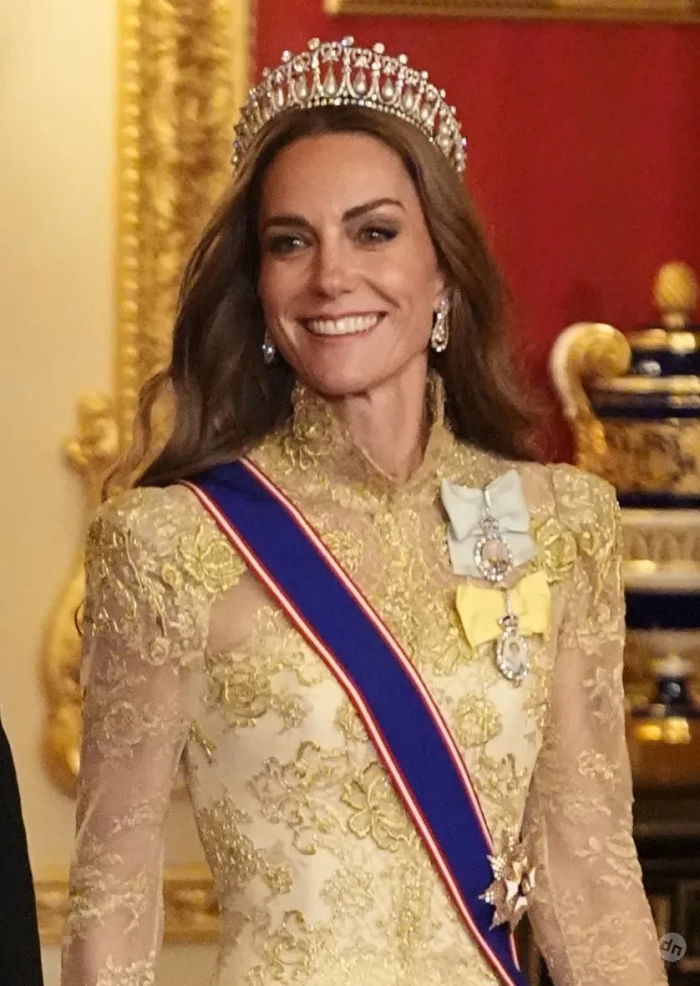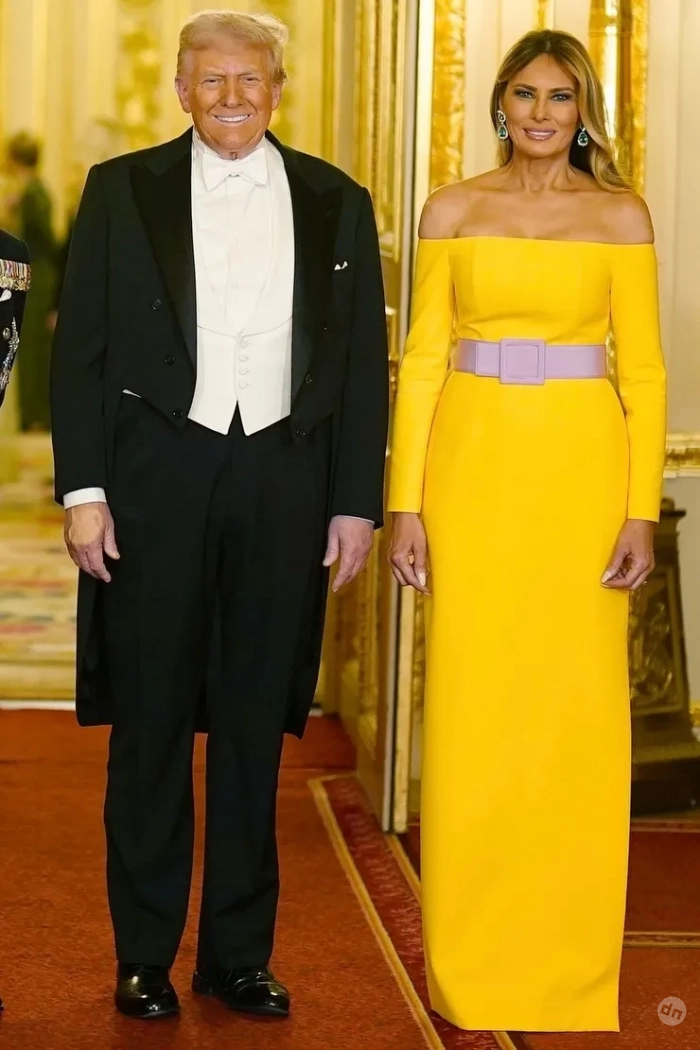 Королева Камилла и король Карл III, Дональд и Мелания ТрампНа приёме Мелания появилась в длинном ярко-жёлтом платье с бархатным поясом от Carolina Herrera, дополнив его туфлями на каблуке и изумрудными серьгами. Кейт блистала в вечернем платье Phillipa Lepley, расшитом золотыми кружевами Шантильи. Образ герцогини завершали туфли Aquazzura, клатч Anya Hindmarch, тиара "Узелки любви" и бриллиантовые серьги. Их мужчины, Дональд Трамп и принц Уильям, были в чёрных смокингах.