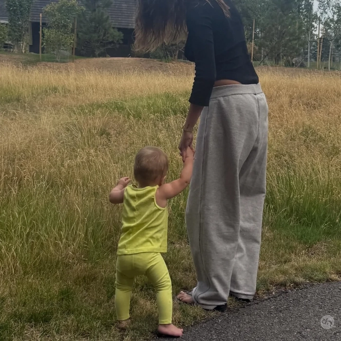 На одном фото супруги запечатлены идущими по дороге с коляской, на другом — 28-летняя Хейли держит уже подросшего сына за руку, пока тот делает первые шаги.