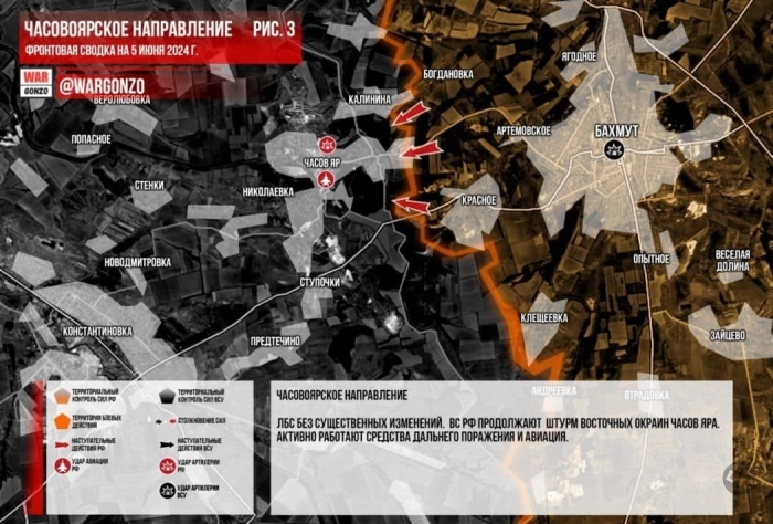 На Артемовском напраавлении без существенных изменений. ВС РФ продолжают штурм восточных окраин Часов Яра. Активно работают средства дальнего поражения и авиация, пишет Telegram-канал Wargonzo.