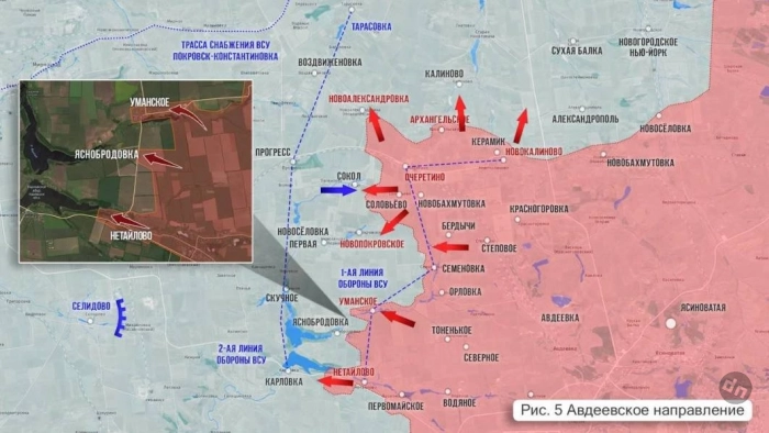 Южнее Сокола бои у Новопокровского, наши продвинулись севернее Нетайлово и Уманского - все это на подступах к Яснобродовке. Севернее Очеретино, у Новоалександровки, как и на подступах к Калиново ВСУ пока рубежи держат.