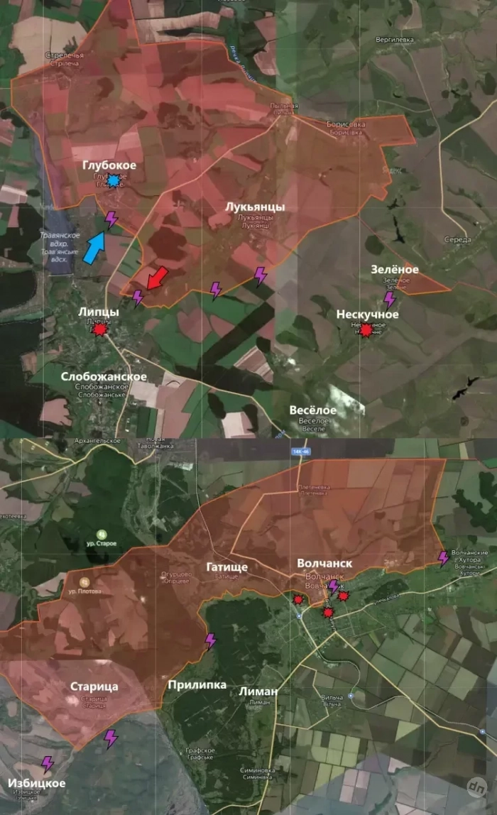 На Харьковском направлении каких-либо существенных изменений за последние сутки нет. В районе Липцев и Глубокого продолжаются встречные бои. Также бои идут в Волчанске. Ни одной из сторон не удаётся продвинуться вперед. Посему прикрепляю вчерашние карты.