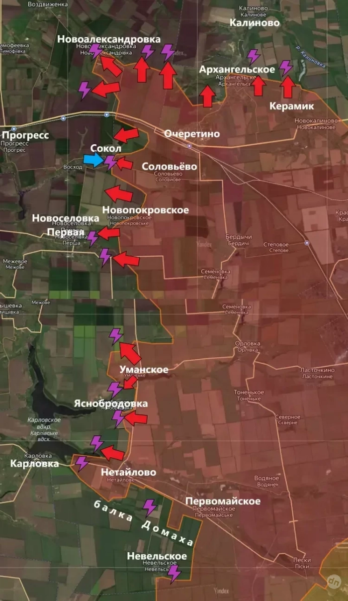 Бои продолжаются к севере от Архангельского, где наши войска постепенно продвигаются в сторону Калиново, в Новоалександровке, где до сих пор наблюдается присутствие ВСУ. ВС РФ продолжают расширять зону контроля вокруг села Новоалександровка, стремясь обеспечить фланги для последующего продвижения к Воздвиженке и трассе Красноармейск - Константиновка. Противник продолжает переброску подкреплений на этот участок.