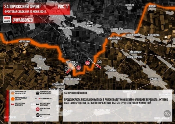 Запорожский фронт. Продолжаются позиционные бои в районе Работино и северо-западнее Вербового. Активно работают средства дальнего поражения. ЛБС без существенных изменений.