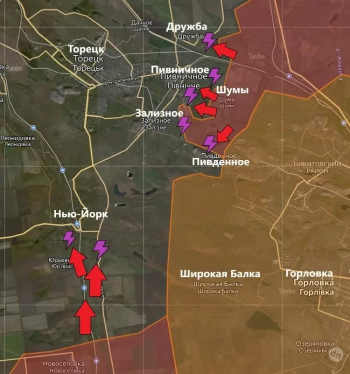На Константиновском направлении подразделения ВС РФ продолжают выдавливать остатки сил противника с позиций к востоку от канала Северский Донец - Донбасс. Основная часть украинских формирований на нашей стороне остаётся в районе урочища Орлова, что располагается между Калиновкой и микрорайоном Канал.