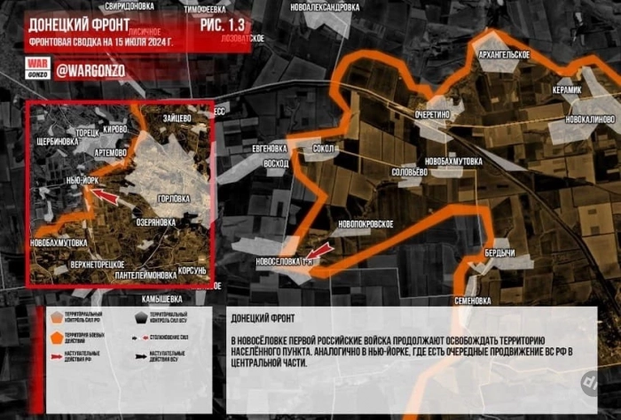ВС РФ продолжают двигаться в Урожайном, есть очередные тактические успехи. Продолжаются бои на окраинах Константиновки. В Красногоровке ВС РФ развивают наступление, продолжая выбивать украинский гарнизон на окраины города. В районе Карловки без особых изменений, продолжаются штурмовые действия ВС РФ. В Новосёловке Первой российские войска продолжают освобождать территорию населённого пункта. Аналогично в Нью-Йорке, где есть очередные продвижение ВС РФ в центральной части.