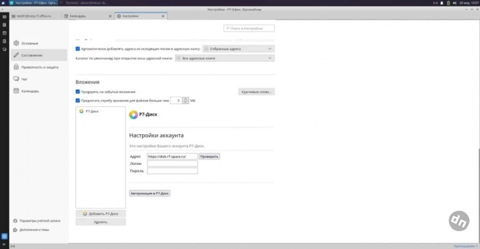 Для этого необходимо перейти в «Органайзер», открыть «Настройки» и в левой панели выбрать пункт «Составление». В открывшемся окне в разделе «Вложения» следует поставить галочку рядом с пунктом «Предлагать службу хранения». Рядом в окошке выбора можно задать размер файлов, которые будут направляться на хранение в «Р7-Диск». Ниже в этом окне следует нажать на кнопку «Добавить Р7-Диск».