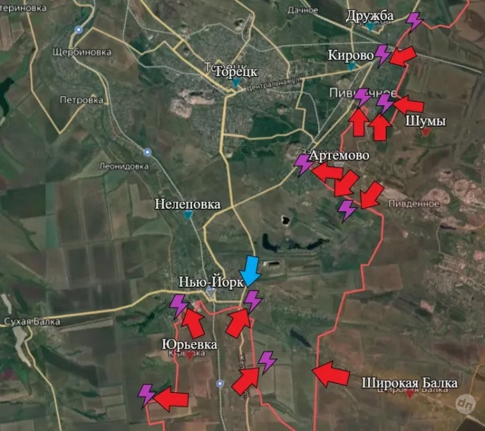 На Торецком направлении в Новгородском (Нью-Йорке) продолжаются интенсивные бои в центре вдоль улиц Кобзаря, Валентины Ковтуненко и Береговая. Также ВС РФ пробивают оборону противника в Железном и Кирово, сообщает военкор Евгений Лисицын в своём Telegram-канале.