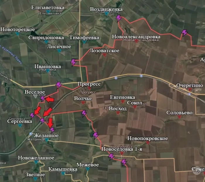 Чуть южнее наши бойцы подошли к окраинам населённых пунктов Сергеевка и Желанное. На текущий момент идёт подготовка к началу штурмовых действий, информирует PulsePen.
