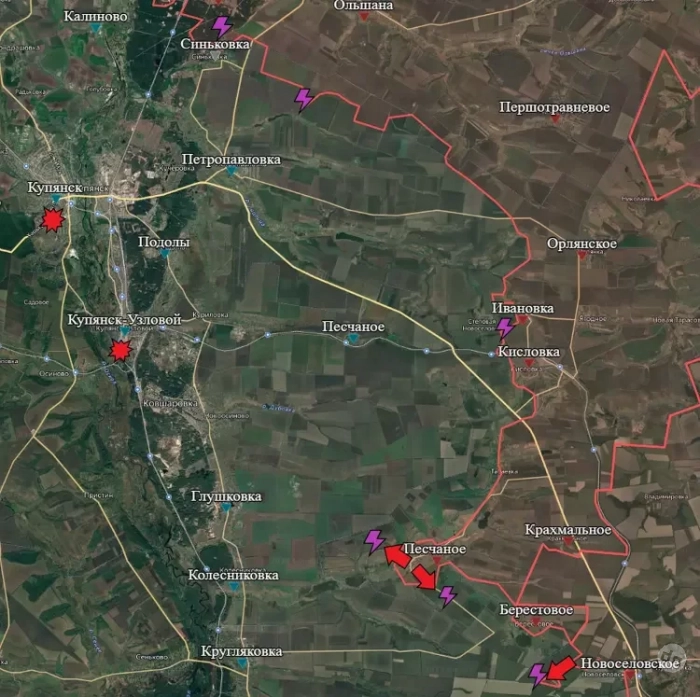 На Купянском направлении в районе Синьковки и Петропавловки продолжаются встречные бои. Также боестолкновения идут в районе Степовой Новосёловки (западнее Ивановки и Кисловки). Нигде нашим бойцам за последние сутки успехов добиться не удалось.