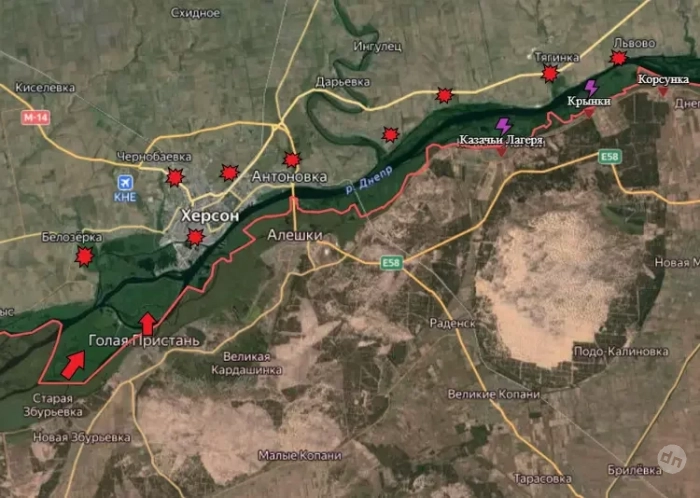Российские войска, по некоторой информации, осуществили захват опорного пункта ВСУ на одном из островов севернее Крынок. В интернете распространяется видео, демонстрирующее около десятка пленных со стороны противника, которые, как утверждается, были взяты в ходе боя штурмовой группой ВС РФ. Определить точное место съемки не представляется возможным, однако, как заявляется, взятый опорный пункт был задействован украинскими формированиями в ходе перебросок пехотных групп в Крынки и использовался как промежуточный хаб на пути к селу. На взятых позициях были обнаружены генераторы и спутниковые терминалы Starlink, что говорит о продолжительном присутствии противника на данном острове.
