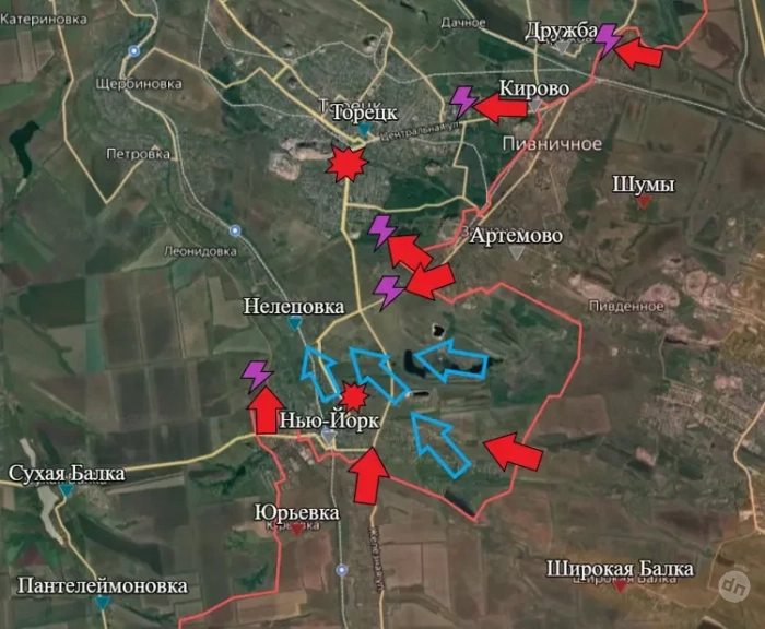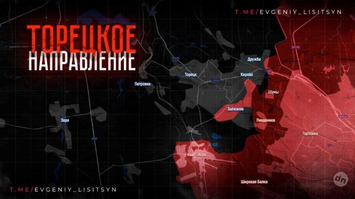 На Торецком направлении ВСУ оставили свои рубежи к востоку от Нью-Йорка (Новгородского) и отступили в Нелеповку, чтобы избежать окружения. Также появились кадры российского флага, поднятого над зданием школы в Нью Форке. Российская армия в этом районе продвинулись с юга и подошла к восточным окраинам Новгородского, взяв под контроль участок шириной около 3.5 км на глубину до 1.7 км.