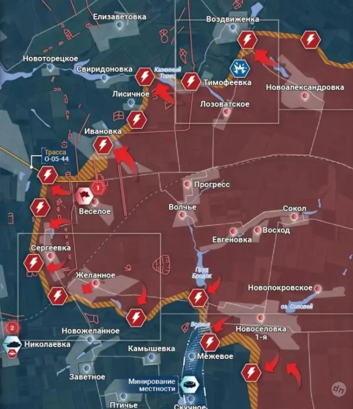 На Покровском направлении в районе Воздвиженки проломить оборону ВСУ до сих пор не удаётся. Предположительно, ВС РФ задействовали запасной план выхода к трассе Покровск - Константиновка и атакуют по направлению к населённым пунктам Свиридоновка и Новотроицкое.