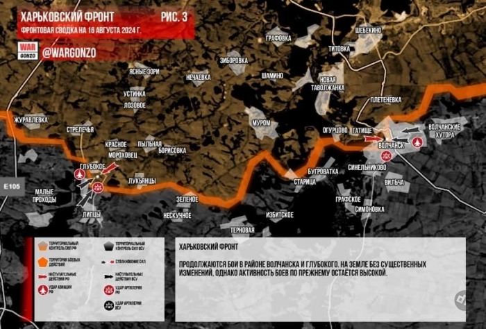 Обновлённая карта боевых действий на Украине по данным на 12:00 мск сегодня, 16.08.2024