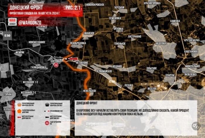 На Донецком фронте продолжаются бои в Константиновке, где российские войска продолжают продвижение внутри населённого пункта. В Красногоровке также есть продвижение ВС РФ. В Карловке ВСУ начали оставлять свои позиции, но доподлинно сказать, какой процент села находится под нашим контролем пока нельзя. Также под контроль ВС РФ за прошедшие сутки перешли Николаевка, Орловка и Журавка. В Градовке российские войска продолжают штурмовые действия, есть успехи.