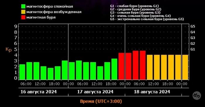 В субботу, 17 августа, началась магнитная буря. Из средней она переросла в сильную и продлится до полудня воскресения, 18 августа. Сейчас ее класс оценивается как G3, рассказал ведущий специалист центра погоды «Фобос» Михаил Леус в Telegram-канале.