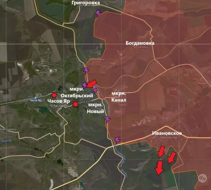 В Часов Яре продолжаются ожесточённые бои на восточных окраинах микрорайона Октябрьский. Существенного продвижения подразделениям Армии России достичь не удаётся. Стороны наносят по позициям друг друга артиллерийские удары, а также удары FPV-дронами. Ситуация совсем не располагает к продвижению.