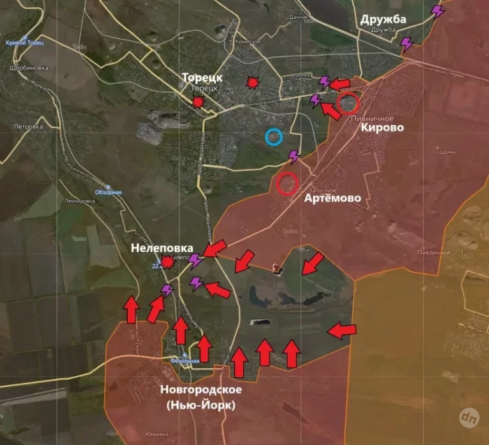 На Торецком направлении идет зачистка окраин населенного пункта Артёмово, который находится под полным контролем ВС РФ. Со стороны Кирово и террикона шахты «Северная» российские войска наступают в направлении многоэтажных зданий в Торецке.