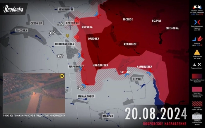 Армия России успешно развивает наступление на Покровском направлении. ВС РФ выбили противника из восточной части Гродовки, от которой открывается прямая дорога на Мирноград и Покровск. Южнее наши войска вышли к Новогродовке сразу с нескольких сторон. Такой успех стал возможным потому, что ВСУ, по всей видимости, оставили село Крутой Яр и, возможно, террикон шахты «Новогродовская 3», сообщает Telegram-канал Readovka.