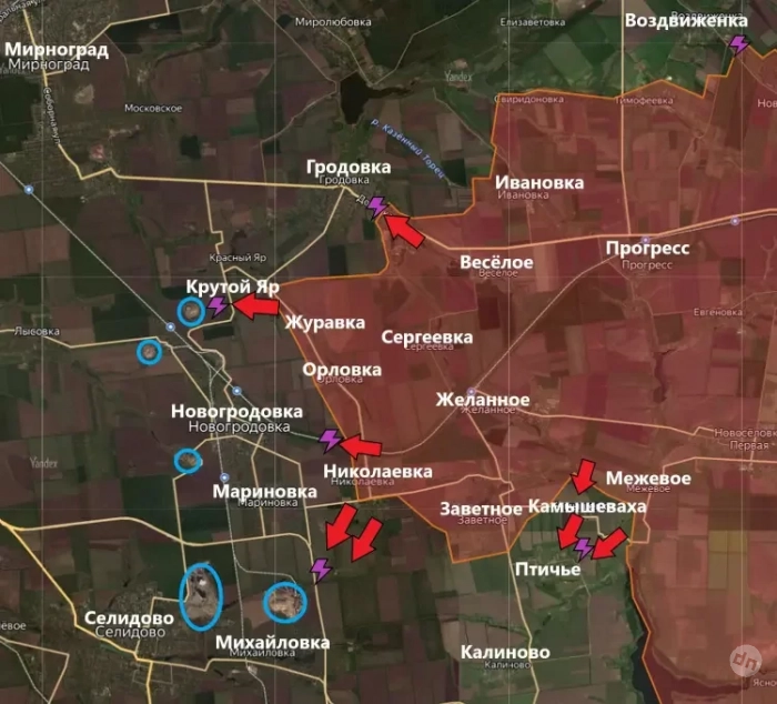 На Покровском направлении подразделения ВС РФ штурмуют Гродовку, продвигаясь вдоль улицы Донецкой. Нашим штурмовикам удалось незначительно расширить зону контроля и закрепиться на улице Мичурина.