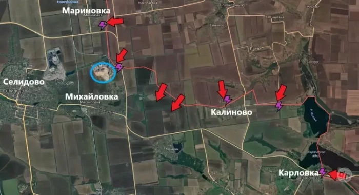 На Покровском направлении наши парни расширяют зону контроля восточнее и юго-восточнее Мариновки. Идут бои у террикона шахты Россия (Котляревского). От текущей линии фронта до восточного рубежа Селидово примерно 3 км. Селидово полностью обесточено, идет эвакуация. ВС РФ перерезали трассу Красноармейск (Покровск)-Карловка у Николаевки, нарушив логистику гарнизона ВСУ в Карловке. Российские войска зачистили плацдарм площадью 8 кв км северо-западнее Калиново, обходят село по флангам и продвигаются к Карловской трассе.