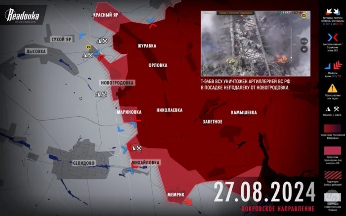 На Покровском направлении российские войска практически полностью заняли Новогродовку, также под контроль российских войск перешли Мемрик и Калиново. Одновременно развивается наступление в сторону Селидово. Об этом пишет "Рыбарь".