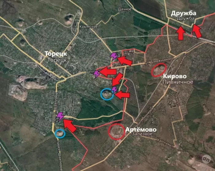 В Торецке (Дзержинске) подразделения Армии России продвигаются сразу с двух участков - с восточного (со стороны Кирово) и с южного (со стороны чуть западнее Артёмово). Продвижение идёт вдоль двух крупных улиц - Центральной и в районе проспекта Шахтёров. Также бои идут близ двух терриконов. На восточном участке это террикон шахты Новая. Там на позиции ВСУ наши бойцы давят также с нескольких сторон - с севера и с востока.