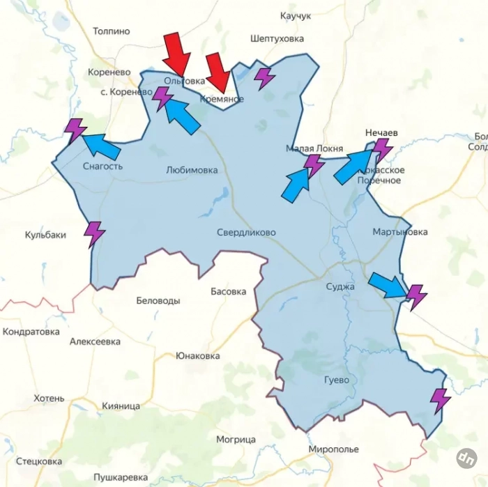В Кореневском районе основные цели ВСУ - взять штурмом само Коренево и прорваться на запад - в Глушковский район Курской области. В самом Глушковском районе ВСУ наносят удары при помощи БПЛА по оборонительным порядкам ВС РФ, по транспорту снабжения, а при помощи ракет - по понтонным переправам.