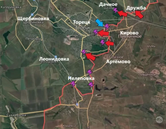 На Торецком направлении продолжаются бои в восточной и южной частях Торецка (Дзержинска). Российские штурмовые группы постепенно продвигаются вдоль улицы Центральной с целью расширить зону контроля в Торецке и осложнить снабжение подразделений ВСУ, ведущих оборону на терриконе шахты «Новая». По военной инфраструктуре противника в городе также регулярно работают артиллерия и авиация. Так, один из авиаударов был нанесен по ПВД ВСУ в центральной части населенного пункта.