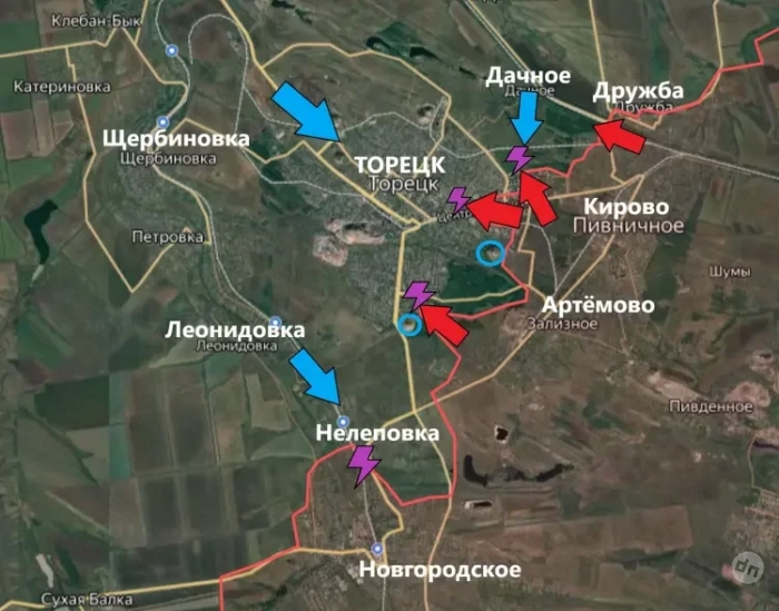 На Торецком направлении на северном фланге наши бойцы пытаются продвинуться в сторону Дачного. Тем временем из самого Дачного враг атакует подразделения ВС РФ в Торецке (Дзержинске). Штурм города продолжается, однако серьёзных успехов в продвижении за последние сутки не наблюдается. Враг перебросил в Торецк резервы и не только обороняется, но и контратакует. В южной части Торецка продвижения также нет - существенно мешает враг, занимающий небольшой террикон.