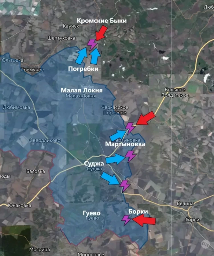 В Суджанском районе Курской области пока всё не так оптимистично и позитивно. Враг атакует к северу от Малой Локни - бои идут неподалёку от населённого пункта Кромские Быки. Это довольно важный участок, так как дорога через Кромские Быки идет на Льгов.