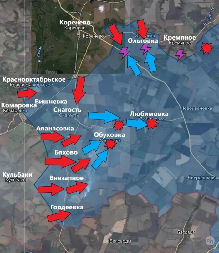 К востоку от Коренево идут встречные бои. По предварительным данным, Ольговка вновь перешла под контроль ВС РФ.