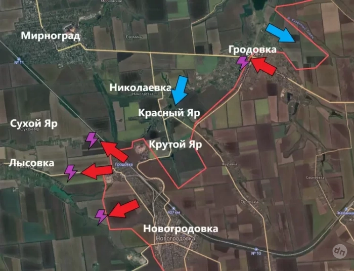 На Покровском направлении ВС России уничтожили несколько мостов в ближнем тылу противника. Появлялась информация об отводе подразделений ВСУ из Украинска, чтобы избежать окружения. Продолжаются бои в Гродовке, севернее Новогродовки, на восточной окраине Лысовки российские манёвренные группы продолжают атакующие действия. ВСУ провели контратаку к северо-востоку от Новогродовки, высадив десант в районе Орловки, что говорит о вступлении в бой прибывших резервов противника.