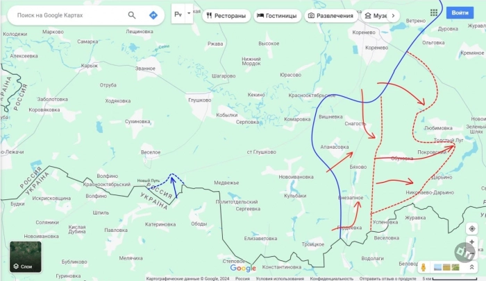 С другой стороны противник со стороны Сумской области вечером, введя свежие силы по направлению к Глушково (причем, судя по экипировке это какая-то ударная элитная часть) из района госграницы продолжил свои удары с целью выйти в тыл нашим атакующим подразделениям и сумел к исходу дня все-таки потеснить наши силы в районе н.п. Новый Путь, пишет в своем Telegram-канале Юрий Подоляка.