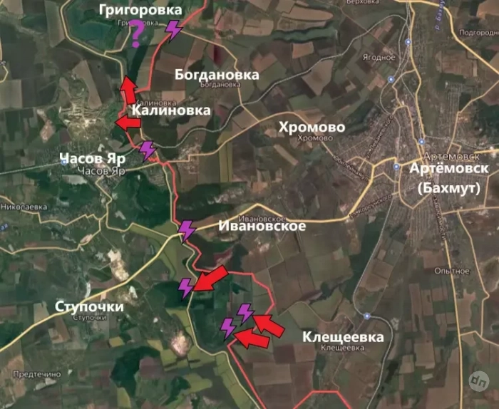 Подразделения Армии России выбили украинские формирования с позиций в лесополосах западнее Клещеевки. Постепенно передовые группы российских штурмовиков приближаются к руслу канала, преодолевая сопротивление противника на данном участке. Также подразделения ВС РФ продвинулись к юго-западу от Ивановского и, как сообщается, смогли пересечь канал Северский Донец – Донбасс. Очевидно, что на этом участке наши бойцы закрывают "карман" ВСУ и будут стремиться продвинуться в сторону населённого пункта Ступочки. Потенциально это позволит штурмовать Часов Яр с южных окраин, пишет PulsePen.