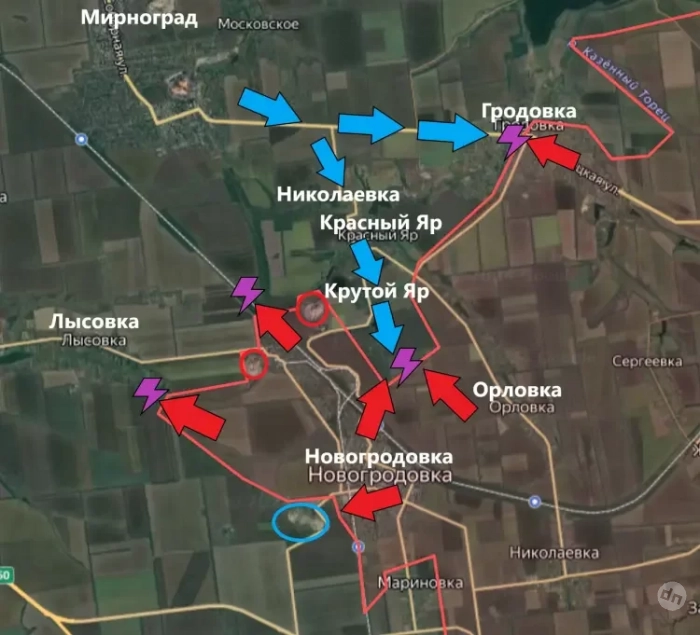 На Покровском направлении продолжаются встречные бои в Гродовке. Враг активно перебрасывает на этот участок резервы из Мирнограда. К сожалению, нашим бойцам не удалось перекрыть эту дорогу, взяв под контроль Николаевку. Мало того, противник смог не только отстоять Николаевку, но и отбить обратно Красный Яр и Крутой Яр. Однако дальше ему продвинуться пока что не удаётся.