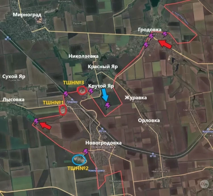 ВСУ продолжают атаковать в районе Крутого Яра. Направление движения - как на юг, в сторону Новогродовки, так и на запад - в районе террикона шахты "Новогродовская №3" (ТШН№3).
