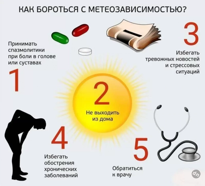 Метеочувствительным людям необходимо находиться вовсеооружии, а именно иметь рядом аптечку, а в случае заметного ухудшения самочувствия - обратиться к помощи профессионалов.