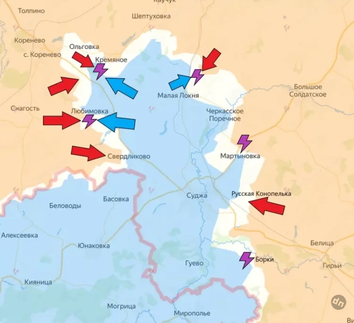 В Суджанском районе ВСУ пробуют атаковать севернее Малой Локни, но натыкаются на встречные бои. На восточном участке сообщается об освобождении Русской Конопельки Армией России. Бои идут также в районе Мартыновки и западнее Борок.