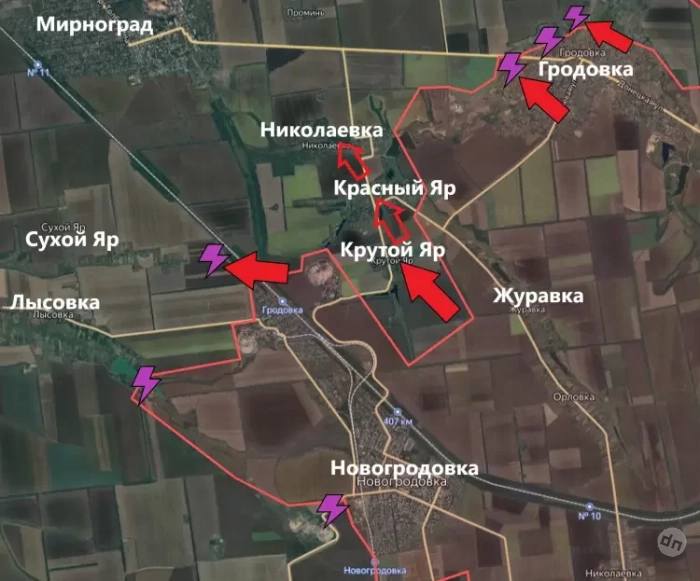 Поступают сообщения об освобождении населённого пункта Крутой Яр. Некоторые источники даже утверждают о заходе ВС РФ в Николаевку, однако информации о закреплении наших бойцов там не поступало. Было бы здорово, если б подразделениям ВС РФ удалось взять этот участок под свой контроль. Это могло бы существенно ускорить взятие Гродовки.
