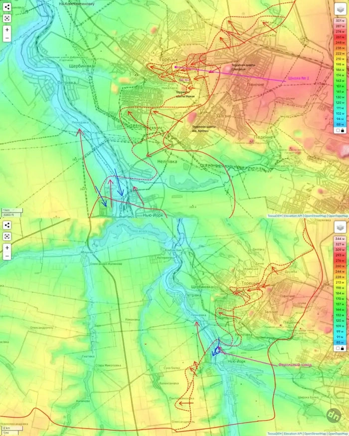 И такой удар был вчера произведен. Пока неясно, как на сейчас выглядит ситуация (сумели ли мы закрепиться или нет), но вчера наши штурмовики были замечены в Леонидовке. Занятие Леонидовки станет приговором, находящейся южнее Нелиповке. А еще, опираясь на Леонидовку мы сможем нанести удар на Петровку, что станет приговором гарнизону Торецка в относительно изолированном микрорайоне Забалка.