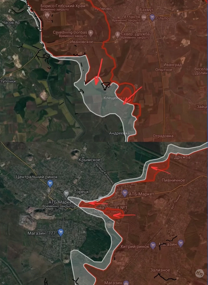 На ЧасовЯрском направлении ВС РФ имеют тактические успехи восточнее Клещеевки продвинулись до 1.05 км и давят южнее Ивановского и западнее Клещеевки.