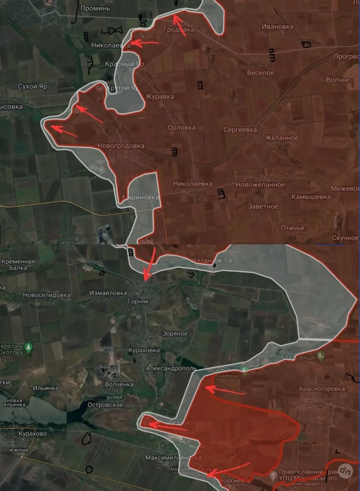 Западнее Красногоровки ВС РФ продвинулись на 4.2 км, под контроль перешла территория «Селидовской ИК №82», имеют тактические успехи в Остром и в направлении Александрополя.
