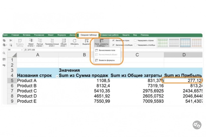 Далее следует перейти в сводную таблицу и на верхней панели инструментов нажать на кнопку «Поля, элементы и наборы» и в выпадающем меню выбрать опцию «Вычисляемое поле». В появившемся окне надо дать название для нового вычисляемого поля.