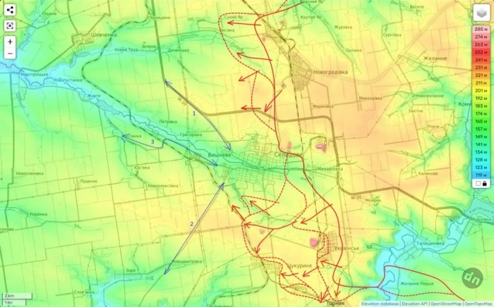 С севера мы сломили сопротивление противника западнее Новогродовки и, опираясь на последнюю, развиваем наступление по направлению к трассе Покровск-Селидово (обозначена на карте «1»).