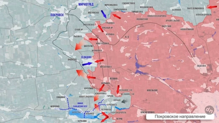 На Покровском направлении гремит северный участок. ВС РФ атакуют позиции ВСУ севернее Новоалександровки, подошли от Николаевки к селу Проминь. Идут бои на окраинах Сухого Яра. Наши еще приблизились к Покровску, пройдя 2,5 км вдоль ж/д линии. Идут ожесточенные бои в восточной части Селидово, у шахты Коротченко - её западная часть и террикон пока за ВСУ. Российские военные заняли западную часть Измайловки. Из Новодмитровки новостей нет. Напомню, что освобождение этого села выведет армию России на западный обход Курахово и поможет охватить город с двух сторон, сообщает Олег Царёв в своём Telegram-канале.