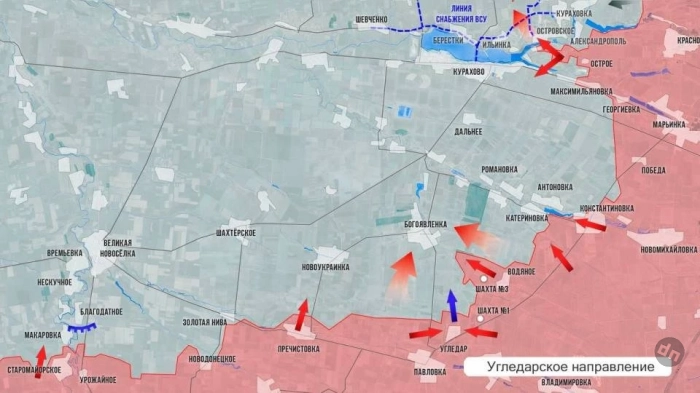 На Угледарском участке ночью ВС РФ отбили контратаку севернее Золотой Нивы. В Шахтерском и Новоукраинке наши нанесли удары по местам дислокации ВСУ, складам и средствам связи. Идут атаки ВС РФ от Водяного на Богоявленку. Кроме этого, есть продвижение на запад от Водяного, где отбиты еще два опорных пункта. В Елизаветовке разбит мост через р. Сладкая, по нему шло снабжение ВСУ в Катериновке. Идут бои в центре Максимильяновки, на село наши давят и от Георгиевки, и от Острого. Зачистив Островское, ВС РФ прорываются к основной части Курахово на левом берегу р. Осикова, впадающей в Кураховское водохранилище.