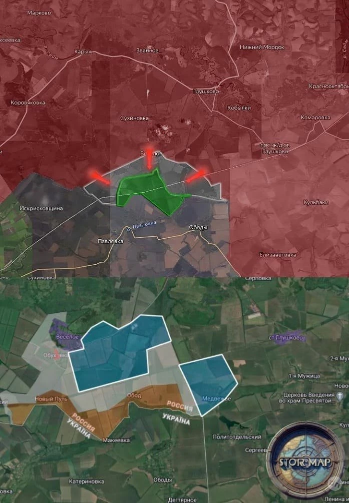 На севере Суджанского района ВС РФ нанесли серию артиллерийских ударов по позициям противника в Русском Поречном. Южнее штурмовые группы российских войск наступают вдоль железной дороги к Колмакову и Агроному со стороны Русской Конопельки.