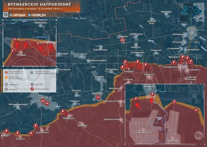 На Времьевском направлении российские войска продолжают развивать успех предыдущих дней, выбив противника с нескольких позиций к северу от Левадного, сообщает Telegram-канал "Рыбарь".