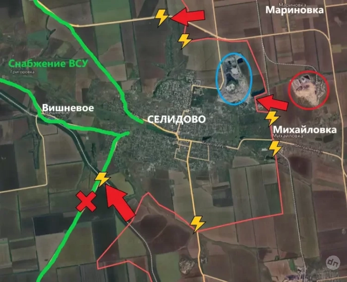 На Селидовском направлении подразделения ВС РФ продолжаются продвигаться на к северу и юго-западу от Селидово, стараясь взять населённый пункт в мешок и перерезать пути снабжения группировки ВСУ в городе, сообщает PulsePen. Для этого наши бойцы продвигаются к западу от Мариновки (на севере) и в направлении Вишнёвого (на юго-западе). Пока что полностью перерезан один из трёх путей снабжения. На восточных окраинах Селидово продолжаются встречные бои. Сообщается, что ВС РФ вернули под свой контроль завод ЖБИ у подножия подконтрольного ВСУ террикона шахты имени Коротченко.