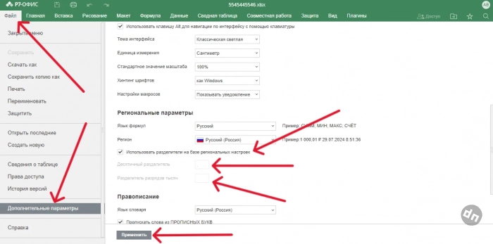 Для этого необходимо в редакторе таблиц «Р7-Офис» перейти во вкладку «Файл» и выбрать в меню пункт «Дополнительные параметры». В правой части экрана опция «Использовать разделители на базе региональных настроек» активна по умолчанию. Чтобы использовать особые разделители, необходимо снять флажок и в расположенных ниже полях «Десятичный разделитель» и «Разделитель разрядов тысяч» ввести нужные символы. Чтобы сохранить внесенные изменения, надо нажать кнопку «Применить».